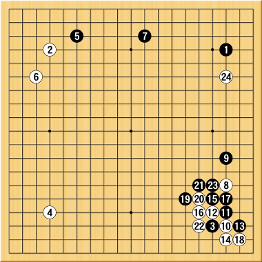 白8に黒9から黒23までと厚みを築いたところで、白24と打ち込みました。右下の定石手順中、黒19では別法もあります。 | |