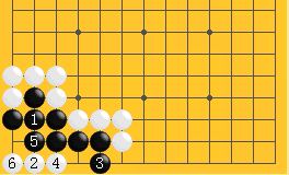 アタリの石を黒1とツグのは失敗です。白2のオキが急所で、黒3と広げても白6まで「隅のマガリ四目」で死にです。