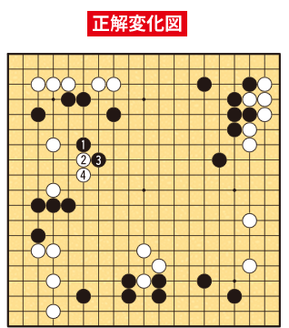 黒1のボウシなら、とりあえず白2、4と進出。黒がこの頭を止めることはできないので、このあと左辺黒への攻めや左上黒の薄みを窺い、これまた白が順調な進行となっています。 |