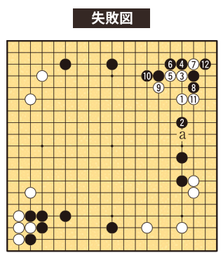 白1は、黒の二間ジマリへの仕掛けと白aのヒラキを見合いにした、適切な打ち込みでした。しかし黒2から4となった時、白5のブツカリは俗手で、治まり形を得ることができません。 |